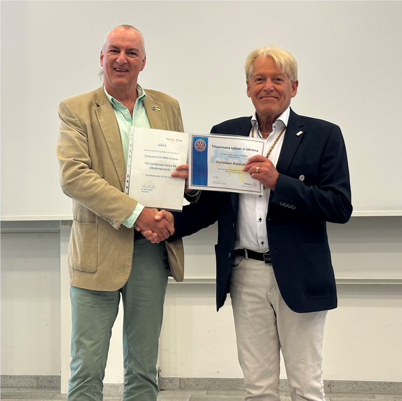 Så har Rotaryåret, som går från 1 juli till 30 juni, avslutats och Karlshamn Rotaryklubb har haft presidentskifte. Avgående president Bo Gardesköld hade i dagens anledning bjudit in Rino Ranheim från Karlskrona-Nova Rotaryklubb för att berätta om Ukrainainsamlingen, och innan han lämnade över presidentskapet till inkommande president Pia Forsare lämnade han även över en check på 10 000 kronor från klubben till förmån för Ukraina.